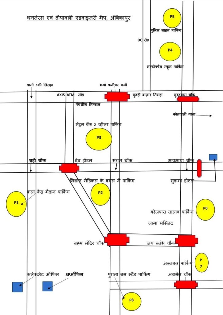 प्रतिवर्ष की भांति इस वर्ष भी दिनांक 18/10/25 को धनतेरस त्यौहार एवं दिनांक 20/10/25 को दीपावली त्यौहार के अवसर पर खरीददारी हेतु शहर में आम जनता का भारी जनसमूह एकत्रित होने की संभावना है। इस दौरान शहर के प्रमुख व्यवसायिक मार्गो मे होने वाली यातायात जाम की समस्याओ कों संज्ञान मे लेकर पुलिस अधीक्षक सरगुजा श्री राजेश कुमार अग्रवाल (भा.पु.से.) द्वारा शहर मे जाममुक्त यातायात व्यवस्था एवं सुरक्षा के कड़े प्रबंध किये जाने के दिशा निर्देश दिए गये है, निर्देशों के परिपालन में चौक चौराहो पर सुरक्षा के कड़े प्रबंध किये गए है, फिक्स पीकेट, आउटर पेट्रोलिंग, नाकाबन्दी सहित यातायात व्यवस्था के सुचारू रूप से संचालन बावत् यातायात व्यवस्था अंतर्गत निम्नानुसार मार्ग व्यवस्था सुनिश्चित किया गया हैं।